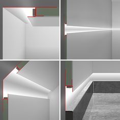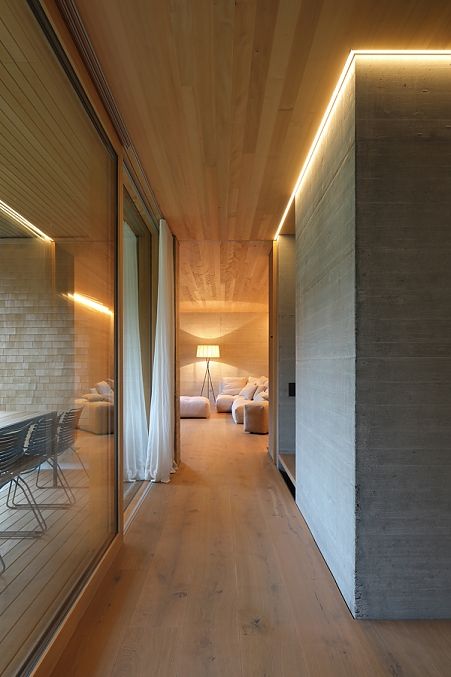 Auf dem ersten Foto eine am Rand laufende Lichtleiste, die den Flur gut ausleuchtet und die Decke einrahmt.